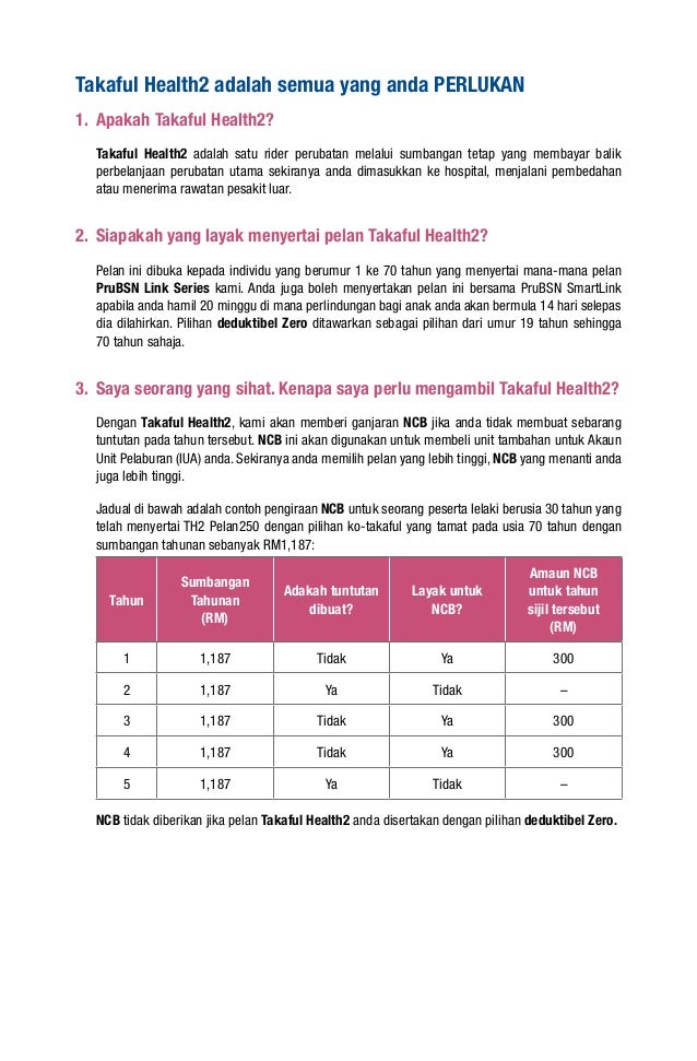 Takaful Health 2 Takaful Health 2 adalah satu rider atau manfaat tambahan. Pelan ini juga menberi ganjaranBonus bagi Tiada Tuntutan NCB jika tiada sebarang tuntutan dibuat bagi tahun. La ligne directrice de l.